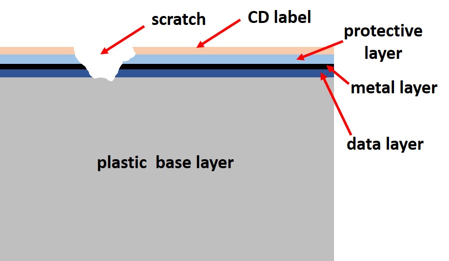 Scratches can occur on the top side or label side of the CD and these scratches will likely damage important layers residing below the disc’s surface. In the structure of a CD the data layer, which carries the information on the disc, and the metal layer, which makes the disc readable, are extremely close to the top surface of the disc. The only protection for these layers is a thin plastic layer and the label. As shown in the schematic image below, a scratch of reasonable depth can damage the metal layer and data layer.